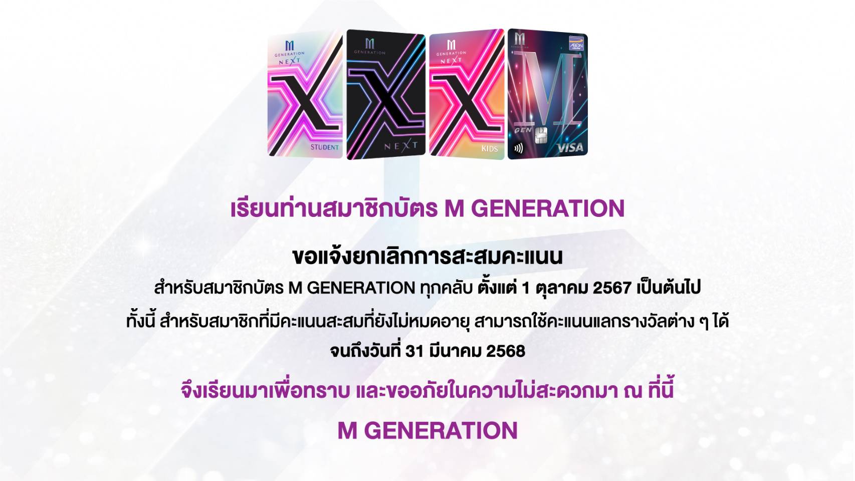 • สิทธิพิเศษจะอยู่ในบัตร M GENERATION ใบปัจจุบัน โดยสมาชิกไม่ต้องทำการเปิดบัตร M GENARATION ใบใหม่
