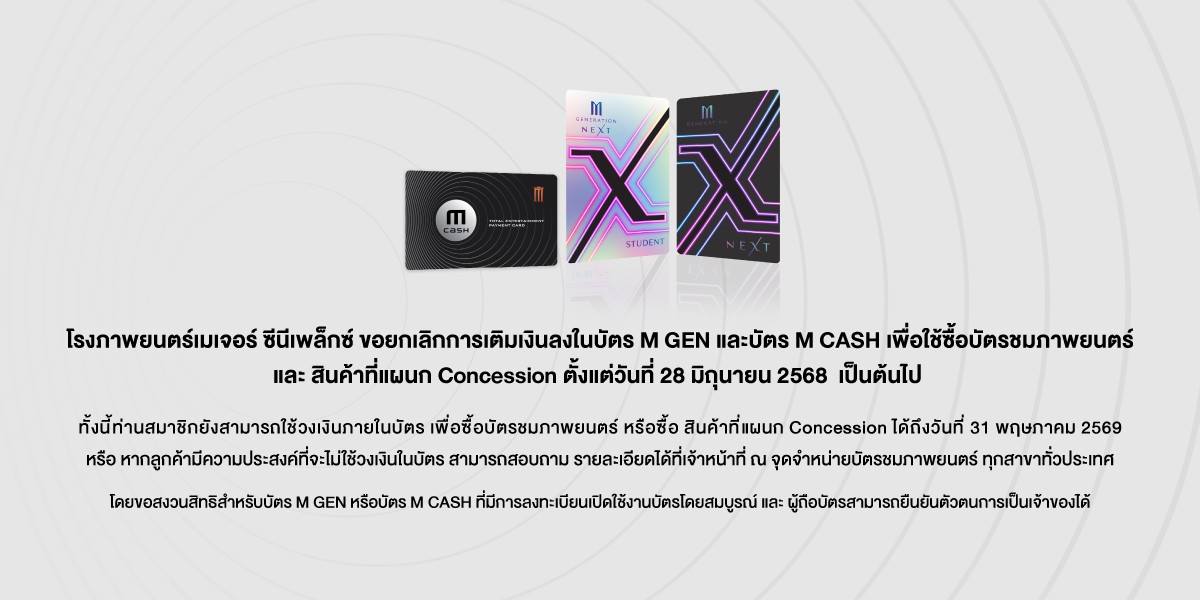 • รับสิทธิ์ซื้อบัตรชมภาพยนตร์ ได้ในราคาสมาชิก บัตร M GEN NEXT (ตามโครงสร้างราคาของแต่ละสาขา)
