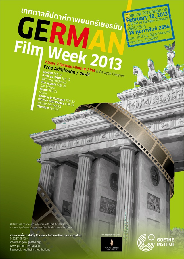 พารากอน ซีนีเพล็กซ์ จับมือ สถาบันเกอเธ่ (ประเทศไทย) รวบรวมสุดยอดภาพยนตร์เรื่องเยี่ยมระดับรางวัล 7 เรื่อง ส่งตรงจากประเทศเยอรมนีมาจัดฉายให้ชมฟรีกันเป็นปีที่สองกับ“เทศกาลสัปดาห์ภาพยนตร์เยอรมัน - German Film Week 2013” ระหว่างวันที่ 18-24กุมภาพันธ์ 2556 รอบเวลา 19.00 น.ของทุกวัน ณ โรงภาพยนตร์พารากอน ซีนีเพล็กซ์ การจัดฉายเทศกาลสัปดาห์ภาพยนตร์เยอรมันในครั้งนี้นับว่าเป็นกิจกรรมที่จะช่วยส่งเสริมความรู้ความเข้าใจทางวัฒนธรรมระหว่างประเทศไทยและเยอรมันให้เพิ่มมากขึ้นผ่านทางภาพยนตร์พร้อมทั้งยังเป็นการสร้างความหลากหลายให้กับการรับชมภาพยนตร์ในประเทศไทยอีกด้วย ซึ่งตลอดทั้ง 7 วันของการจัดงานเทศกาลดังกล่าว ผู้ชมจะได้รับชมภาพยนตร์เยอรมันคุณภาพที่ได้คัดสรรมาแล้วโดยสถาบันเกอเธ่ (ประเทศไทย) รวม 7 เรื่อง โดยไฮไลท์ของงานอยู่ที่การฉายภาพยนตร์เรื่องเรื่องใหม่แกะกล่อง Goethe ภาพยนตร์ที่อ้างอิงจากชีวิตจริงของกวีเอก ของประเทศเยอรมนี Johann Wolfgang Goethe นำแสดงโดยนักแสดงมากความสามารถและเป็นที่รู้จัก อเล็กซานเดอร์ เฟห์ลิ่ง (Alexander Fahling) และ มอริทซ์ ไบลบ์ทรอย (Moritz Bleibtreu) ซึ่งจะพาผู้ชมย้อนอดีตไปยังปี ค.ศ. 1772 เพื่อพบกับเรื่องราวชีวิตของเกอเธ่ในวัย 23 ปี ผู้ซึ่งทุ่มเทใจกายเพื่อการเป็นนักกวี ภาพยนตร์อีกเรื่องที่พลาดไม่ได้ในเทศกาลฯ คือ Berlin is in Germany กำกับโดย ฮันเนส ชเตอฮร์ส(Hannes Stöhrs) เรื่องราวของการเปลี่ยนแปลงหลังจากการพังทลายของกำแพงเบอร์ลิน ที่ได้รับรางวัลมากมายมาแล้วจากเทศกาลต่างๆ ไม่ว่าจะเป็น รางวัลนักแสดงนำชายยอดเยี่ยมจาก German Film Critics Award 2002 รางวัลขวัญใจผู้ชมจาก International Film Festival Berlin 2001 และปิดท้ายเทศกาลภาพยนตร์ในวันอาทิตย์ที่ 24 กุมภาพันธ์ 2555 ด้วยเรื่อง Rapunzel ในแบบฉบับเยอรมัน ซึ่งเป็นเทพนิยายเรื่องดังจากผลงานการประพันธ์ของนักภาษาศาสตร์ชาวเยอรมัน “สองพี่น้องกริมม์“ นั่นเอง ตารางการจัดฉายภาพยนตร์ 18 กุมภาพันธ์ 2555 ฉายภาพยนตร์เรื่อง Goethe! 19 กุมภาพันธ์ 2555 ฉายภาพยนตร์เรื่อง If not us, WHO (Wer wenn nicht wir) 20 กุมภาพันธ์ 2555 ฉายภาพยนตร์เรื่อง The System(Das System) 21 กุมภาพันธ์ 2555 ฉายภาพยนตร์เรื่อง Storm (Sturm) 22 กุมภาพันธ์ 2555 ฉายภาพยนตร์เรื่อง Berlin is in Germany 23 กุมภาพันธ์ 2555 ฉายภาพยนตร์เรื่อง Whisky with Wodka (Whisky mit Wodka) 24 กุมภาพันธ์ 2555 ฉายภาพยนตร์เรื่อง Rapunzel ภาพยนตร์จากประเทศเยอรมนีทั้งหมด 7 เรื่อง 7 แนว ให้เสียงภาษาเยอรมัน พร้อมคำบรรยายภาษาอังกฤษทุกเรื่อง เพื่อมอบความหลากหลายให้กับผู้ชมที่สนใจ โดยไม่เสียค่าเข้าชม ผู้ที่สนใจสามารถโทรสำรองที่นั่งล่วงหน้าหรือติดต่อสอบถามรายละเอียดเพิ่มเติมได้ที่ สถาบันเกอเธ่ (ประเทศไทย) โทร. 02-287-0942-4 หรือ อีเมล์ info@bangkok.goethe.org หรือ เว็บไซ
