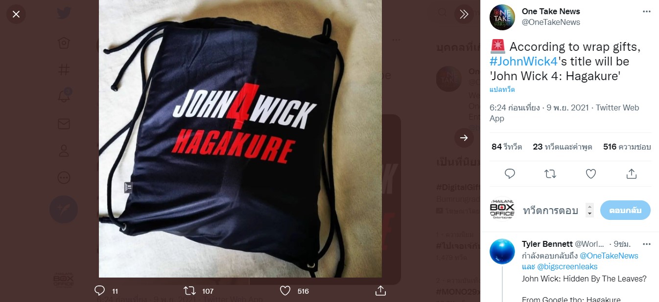 ภาพข้างบนนี้ถูกโพสต์โดยเจ้าของบัญชีทวิตเตอร์ One Take News เป็นภาพของขวัญที่มอบให้กับทีมงานหลังจากถ่ายทำภาพยนตร์เรื่อง John Wick 4 เสร็จสิ้น ความพิเศษก็คือมันเปิดเผยชื่อภาคของภาพยนตร์เรื่องนี้ด้วย โดยจะมาในชื่อ John Wick 4: Hagakure