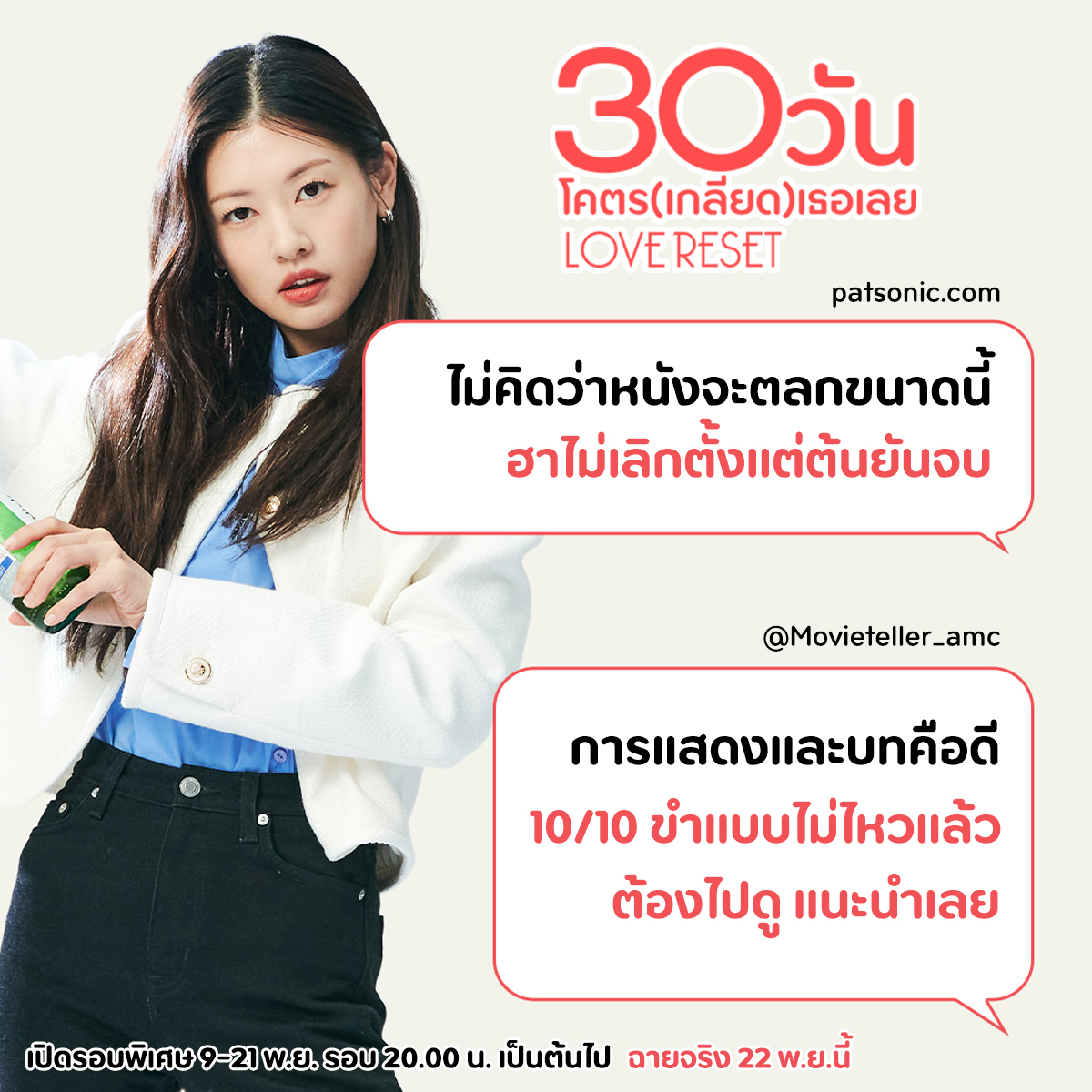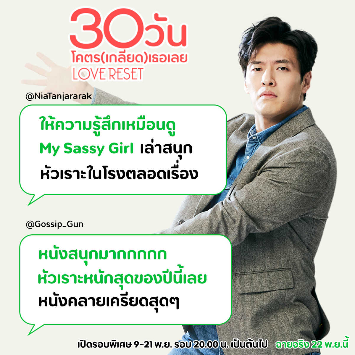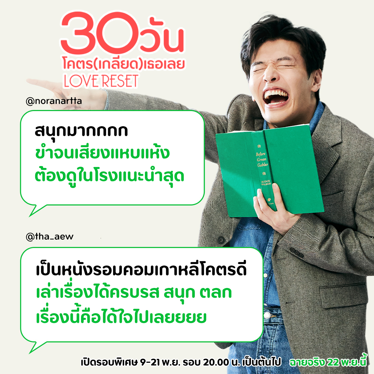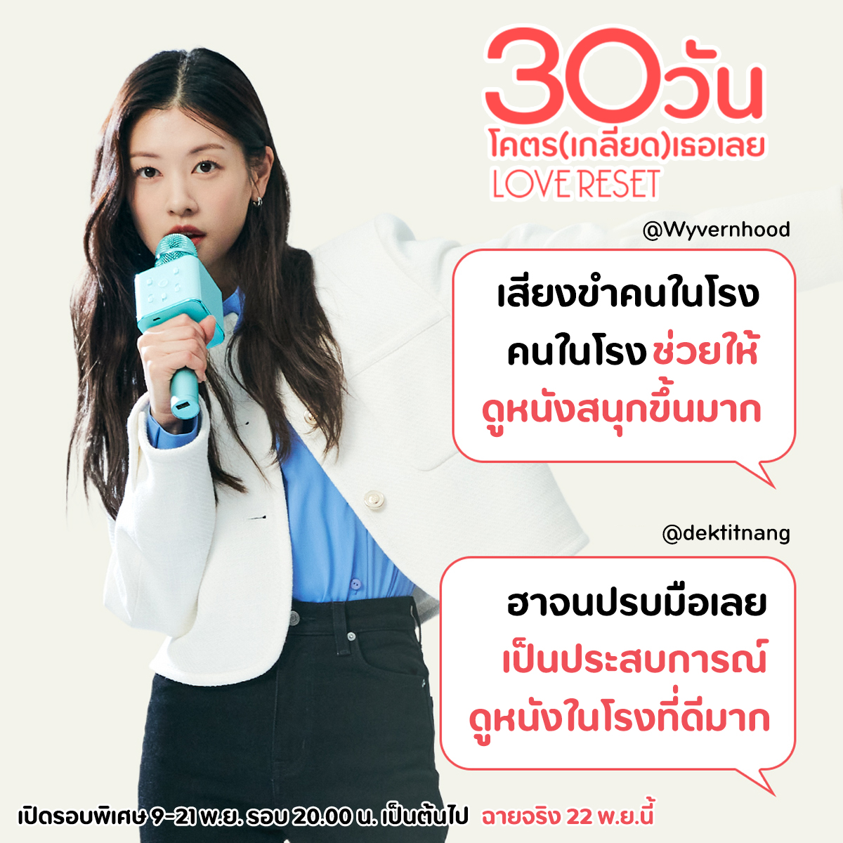 เปิดรอบพิเศษ 9-21 พฤศิกายนนนี้ รอบเวลา 20.00น เป็นต้นไป เฉพาะ โรงฯพารากอน, เซ็นทรัลเวิลด์ และโรงฯเฮ้าส์สามย่าน พิสูจน์ความฮาจนกรามค้างด้วยตัวคุณเองใน “Love Reset 30 วันโคตร(เกลียด)เธอเลย” 22 พฤศจิกายน ในโรงภาพยนตร์