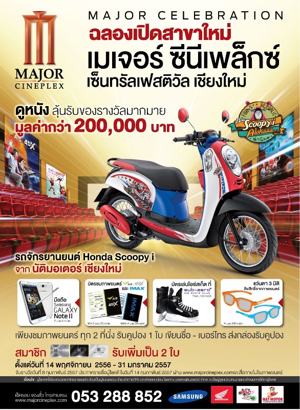 ผู้โชคดีที่ได้รับรางวัลรถจักรยานยนต์ฮอนด้า และรางวัลโทรศัพท์มือถือ Samsung เมเจอร์ ซีนีเพล็กซ์ได้ทำการโทรแจ้งผู้โชคดีพร้อมนัดหมายการรับมอบรางวัลในวันเสาร์ที่ 15 ก.พ.57 ณ โรงภาพยนตร์เมเจอร์ ซีนีเพล็กซ์ สาขาเซ็นทรัลเฟสติวัล เชียงใหม่