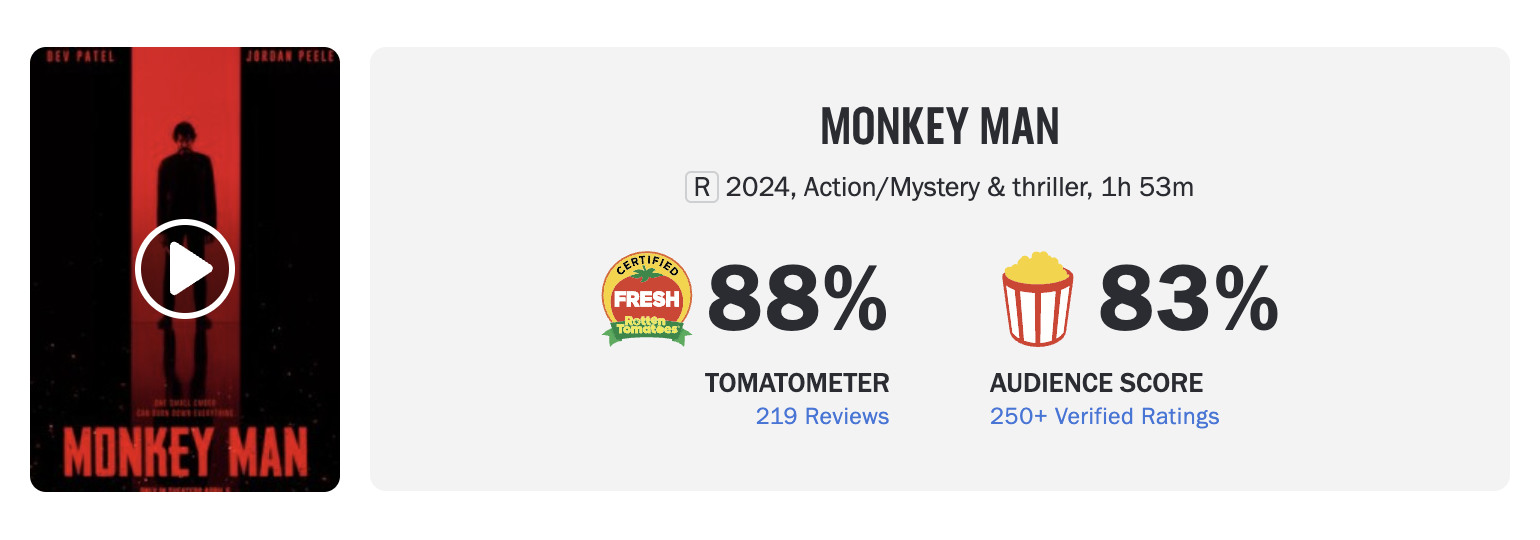 หลังจากเข้าฉายในสหรัฐอเมริกาไปเมื่อช่วงท้ายสัปดาห์ก่อน ก็ได้มีการเปิดเผยคะแนนชุดแรกของ Monkey Man หรือ มังกี้แมน ภาพยนตร์แอคชั่นที่ เดฟ พาเทล ทำหน้าที่เป็นทั้งผู้กำกับ, นักแสดงนำ และมือเขียนบท ออกมาแล้ว โดยถือว่ามันเป็นคะแนนที่ยอดเยี่ยมเลยทีเดียว หากมองว่ามันเป็นผลงานการกำกับภาพยนตร์เรื่องแรกของ พาเทล