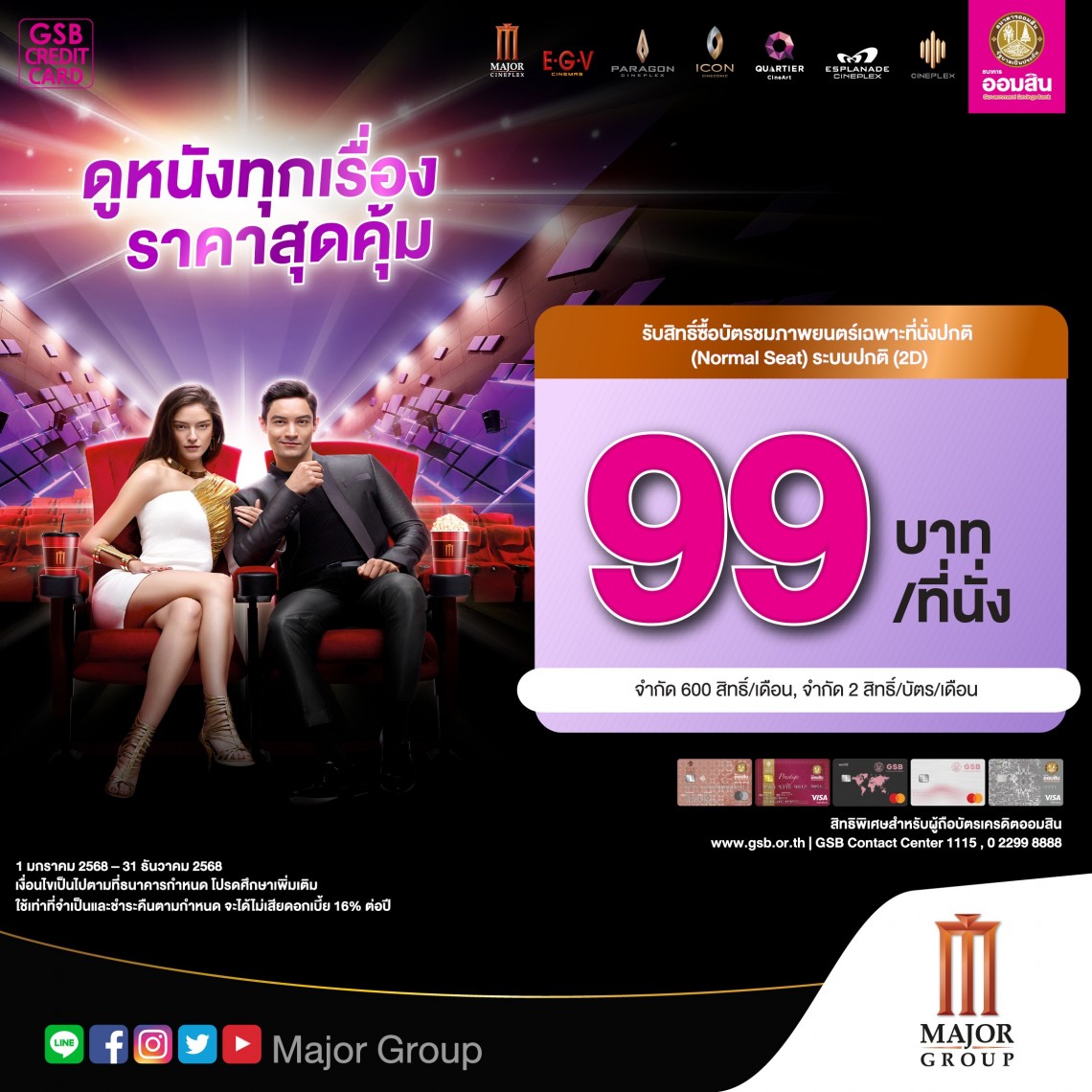 สำหรับผู้ถือบัตรเครดิตธนาคารออมสินทุกประเภท รับสิทธิ์ซื้อบัตรชมภาพยนตร์เฉพาะที่นั่งปกติ (Normal Seat) ในระบบปกติ (2D) เท่านั้น ได้ในราคา 99 บาท ต่อที่นั่ง ณ โรงภาพยนตร์เครือ เมเจอร์ ทุกสาขาที่ร่วมรายการ โดยชำระค่าบัตรชมภาพยนตร์ผ่านบัตรเครดิตธนาคารออมสิน