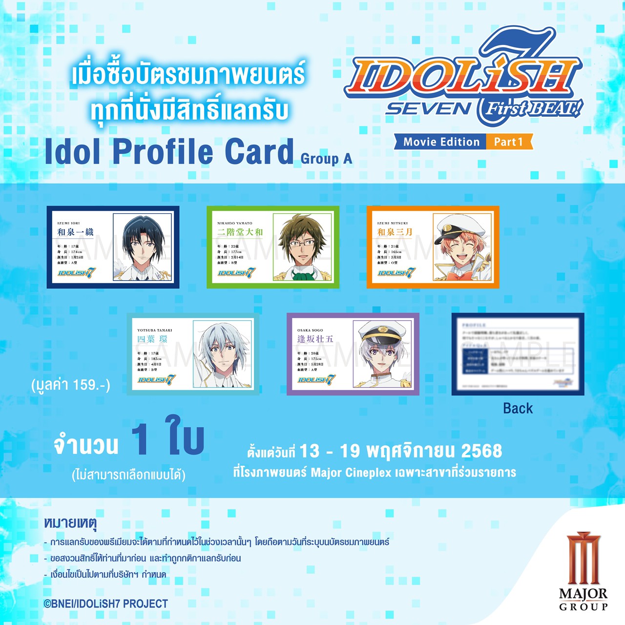 • ซื้อบัตรชมภาพยนตร์เรื่อง IDOLiSH7 ทุกที่นั่ง มีสิทธิ์รับ Idol Profile Card จำนวน 1 ใบ (แบบสุ่ม ไม่สามารถเลือกลายได้) มูลค่า 159 บาท